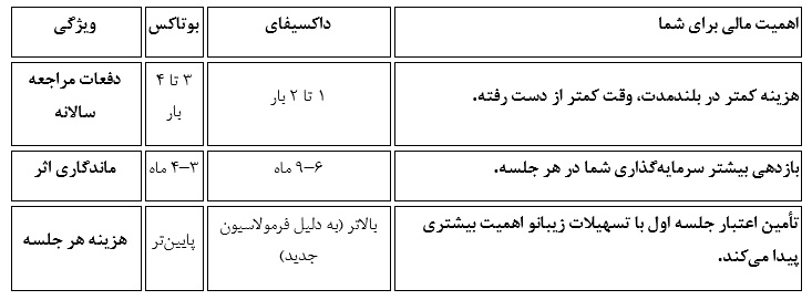 چه داکسیفای را برای ماندگاری طولانیمدت انتخاب کنید (که هزینه هر جلسهاش بالاتر است)، یا بوتاکس را به دلیل سابقه طولانیاش، تأمین مالی نباید مانع باشد.