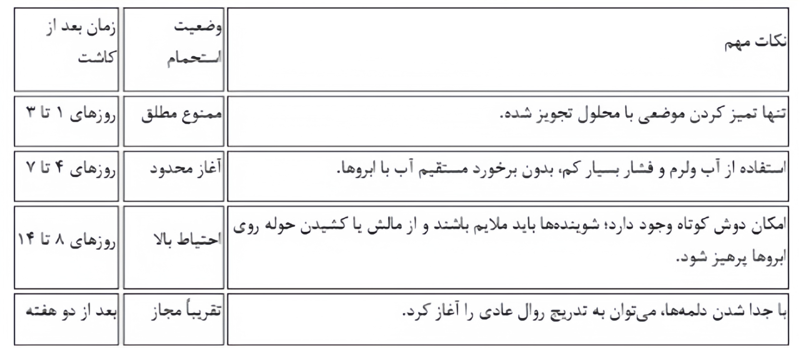 قانون اصلی: حداقل سه تا پنج روز بعد از کاشت ابرو، دوش گرفتن به روش عادی ممنوع است.